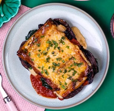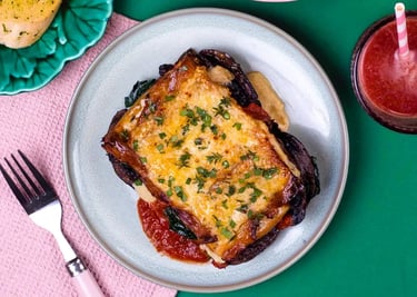 A plant-based take on traditional lasagne, layered with slow-cooked tomato sauce, sautéed garlic mushrooms, steamed spinach, and a creamy, cheezy béchamel sauce.