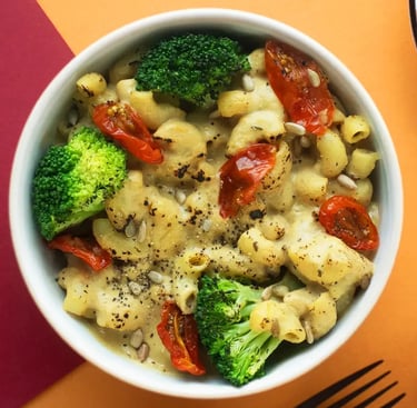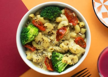 Creamy, indulgent, and completely dairy-free! This dish features little macaroni shells tossed in a velvety cashew cheese sauce, complemented by sun-blushed cherry tomatoes and steamed broccoli.