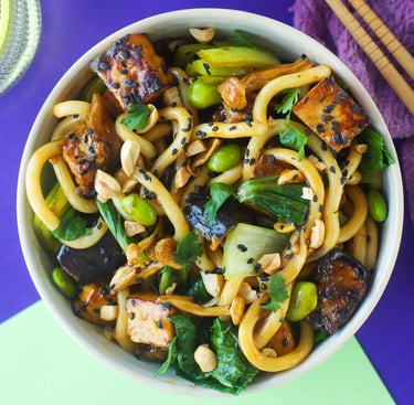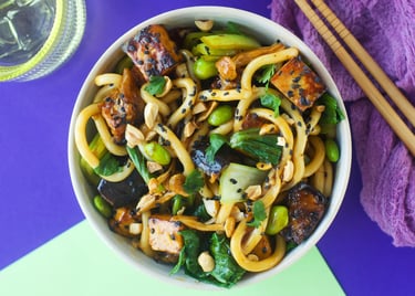 Thick udon noodles coated in a rich yaki-miso sauce, combined with bok choy, shiitake mushrooms, roasted tofu, aubergine, crunchy peanuts, and black sesame seeds for a perfect umami-packed bite.