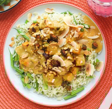 A fragrant red Thai curry infused with kaffir lime, fine beans, roasted sweet potato, and okra, served over aromatic jasmine rice and topped with chopped peanuts and coconut.